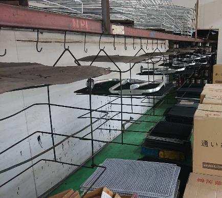 ベルトコンベア式の流れ作業・30mの焼付炉による生産性と品質の高さが強みです。