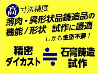 「石膏鋳造」は、金型不要で量産金属成形「精密ダイカスト」と同等レベルの品質精度鋳造が可能な工法で、薄肉、自由度の高い形状、優れた鋳肌の仕上がりの部品が 製造できます。