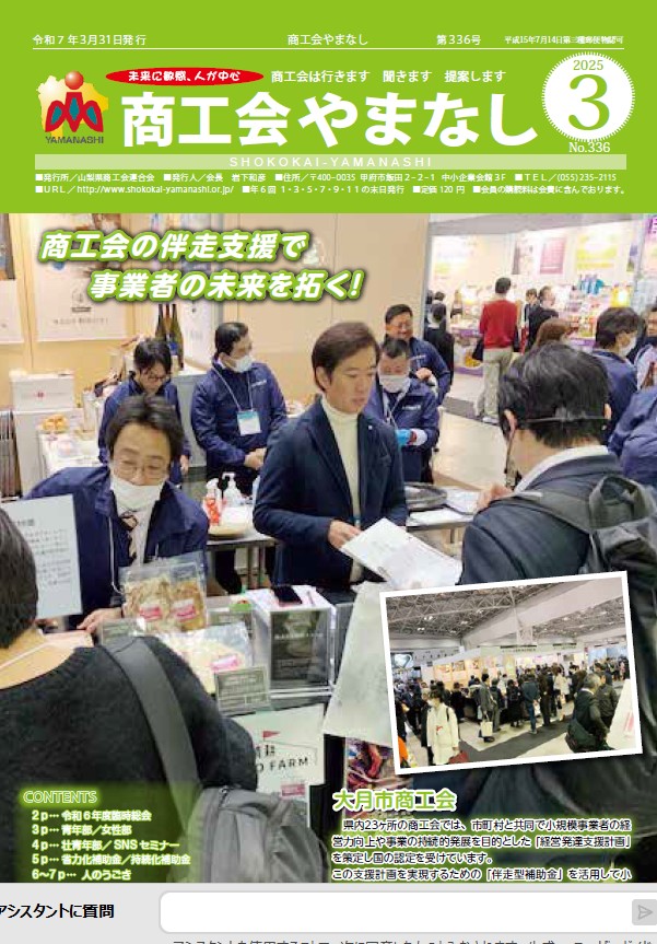 ![]() | vol.337令和7年6月30日発行 2P 令和7年度県連通常総会 / 栄えある受賞者 3P 青年部 / 女性部 / 壮青年部 4P 専門家派遣制度 5P 一歩夢向うへ(RBB株式会社) 6P 商工会TOPICS(北杜市商工会) 7P デジ推しフェス 8P 商工会なう / しあわせ調査員 |